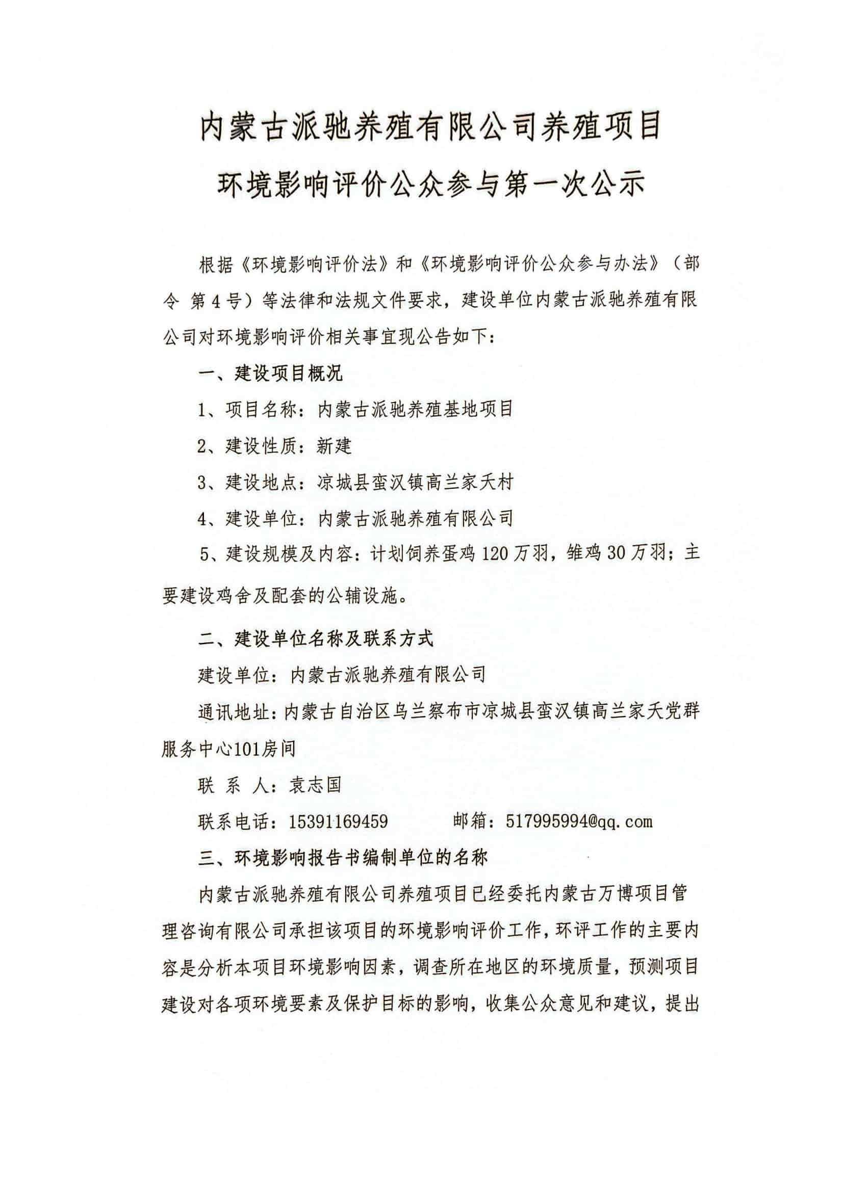內蒙古派馳養殖有限公司養殖項目環境影響評價公眾參與第一次公示